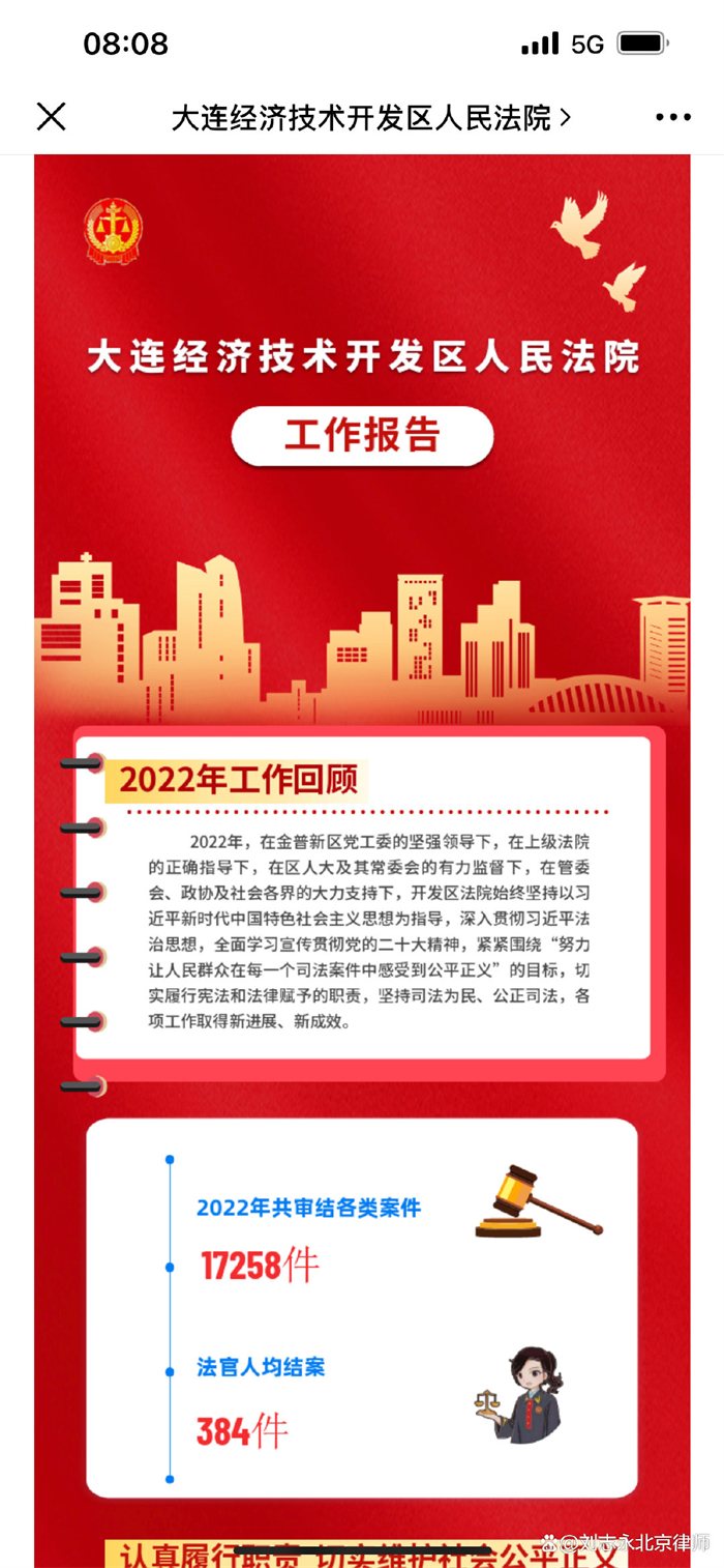 大連經(jīng)濟技術(shù)開(kāi)發(fā)區人民法院的《工作報告》公布了兩個(gè)數字,2022年審結案件17258件,人均結案384件。這兩個(gè)數字體現了開(kāi)發(fā)區法院一年的工作成果,更體現一線(xiàn)法官付出的汗水和心血。